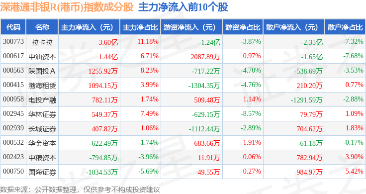 资金流向方面,深港通非银R(港币)(483054)指数成份股当日主力资金净流出合计6.66亿元,游资资金净流入合计3.08亿元,散户资金净流入合计3.59亿元。成份股资金流向详情见下表: