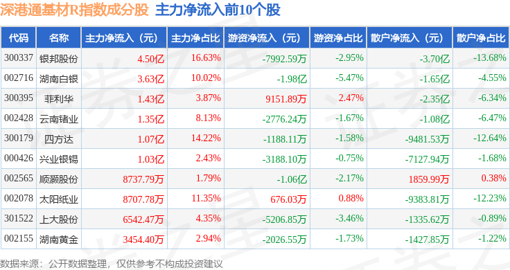 资金流向方面,深港通基材R(483061)指数成份股当日主力资金净流出合计50.9亿元,游资资金净流入合计3271.96万元,散户资金净流入合计50.57亿元。成份股资金流向详情见下表: