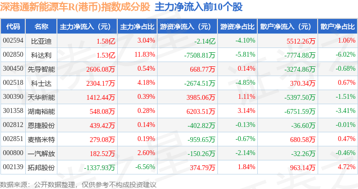 资金流向方面,深港通新能源车R(港币)(483088)指数成份股当日主力资金净流出合计75.84亿元,游资资金净流入合计14.76亿元,散户资金净流入合计61.09亿元。成份股资金流向详情见下表: