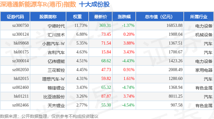 深港通新能源车R(港币)(483088)指数十大成份股详情如下: