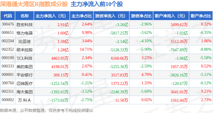 资金流向方面,深港通大湾区R(483089)指数成份股当日主力资金净流出合计12.26亿元,游资资金净流出合计1.42亿元,散户资金净流入合计13.68亿元。成份股资金流向详情见下表: