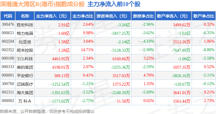 资金流向方面,深港通大湾区R(港币)(483090)指数成份股当日主力资金净流出合计12.26亿元,游资资金净流出合计1.42亿元,散户资金净流入合计13.68亿元。成份股资金流向详情见下表: