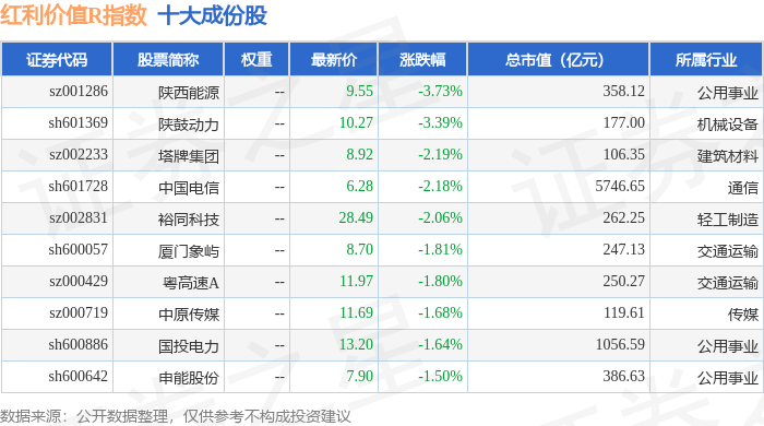 证券之星消息,12月29日,红利价值R(489016)指数报收于7805.58点,跌0.5%,成交263.54亿元,换手率0.26%。当日该指数成份股中,上涨的有21家,景津装备以4.12%的涨幅领涨,下跌的有28家,陕西能源以3.73%的跌幅领跌。