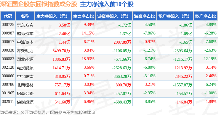 资金流向方面,深证国企股东回报(970064)指数成份股当日主力资金净流出合计10.4亿元,游资资金净流入合计2.26亿元,散户资金净流入合计8.15亿元。成份股资金流向详情见下表: