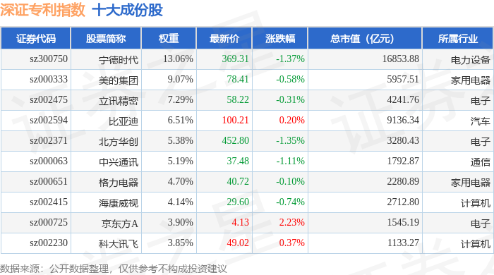 深证专利(970067)指数十大成份股详情如下:
