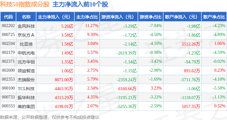 资金流向方面,科技50(970080)指数成份股当日主力资金净流出合计43.71亿元,游资资金净流入合计6.1亿元,散户资金净流入合计37.6亿元。成份股资金流向详情见下表: