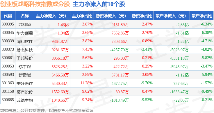 资金流向方面,创业板战略科技(971004)指数成份股当日主力资金净流出合计10.34亿元,游资资金净流入合计5.42亿元,散户资金净流入合计4.92亿元。成份股资金流向详情见下表: