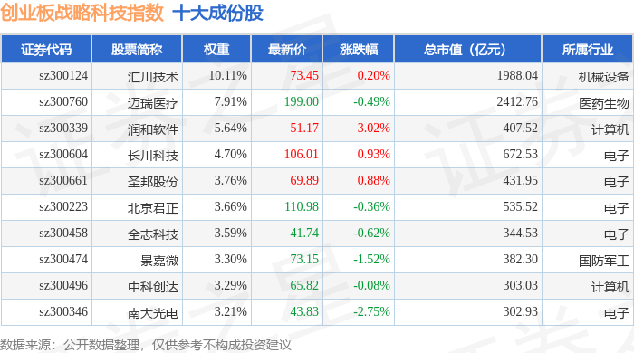 证券之星消息,12月29日,创业板战略科技(971004)指数报收于6555.71点,涨0.03%,成交391.09亿元,换手率4.28%。当日该指数成份股中,上涨的有17家,美好医疗以8.3%的涨幅领涨,下跌的有31家,神农种业以4.09%的跌幅领跌。