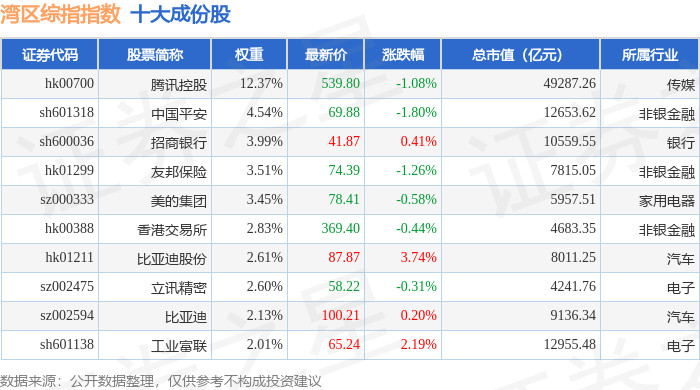 湾区综指(980003)指数十大成份股详情如下: