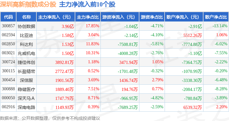 资金流向方面,深圳高新(980038)指数成份股当日主力资金净流出合计32.48亿元,游资资金净流入合计3.25亿元,散户资金净流入合计29.23亿元。成份股资金流向详情见下表: