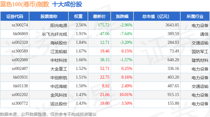 蓝色100(港币)(980069)指数十大成份股详情如下: