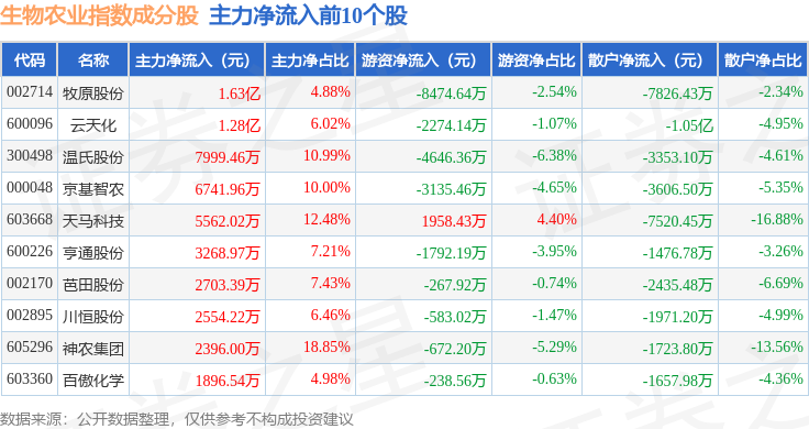 资金流向方面,生物农业(980072)指数成份股当日主力资金净流出合计2.43亿元,游资资金净流出合计5279.96万元,散户资金净流入合计2.69亿元。成份股资金流向详情见下表: