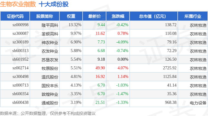 生物农业(980072)指数十大成份股详情如下: