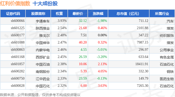 证券之星消息,12月29日,红利价值(980103)指数报收于3213.16点,跌0.07%,成交338.41亿元,换手率0.41%。当日该指数成份股中,上涨的有21家,南钢股份以4.05%的涨幅领涨,下跌的有25家,内蒙华电以5.01%的跌幅领跌。