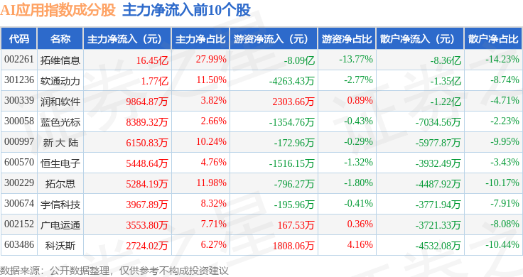 资金流向方面,AI应用(980112)指数成份股当日主力资金净流入合计5.73亿元,游资资金净流出合计6.44亿元,散户资金净流入合计7125.6万元。成份股资金流向详情见下表: