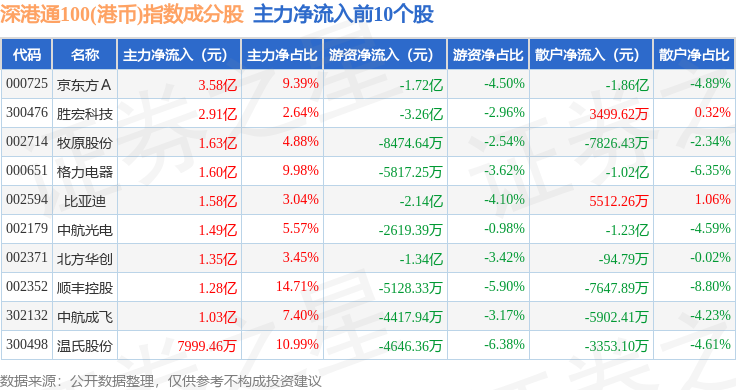 资金流向方面,深港通100(港币)(983008)指数成份股当日主力资金净流出合计70.79亿元,游资资金净流入合计30.86亿元,散户资金净流入合计39.92亿元。成份股资金流向详情见下表: