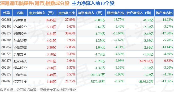 资金流向方面,深港通电脑硬件(港币)(983044)指数成份股当日主力资金净流出合计1.8亿元,游资资金净流出合计13.01亿元,散户资金净流入合计14.81亿元。成份股资金流向详情见下表: