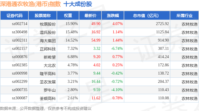 深港通农牧渔(港币)(983052)指数十大成份股详情如下:
