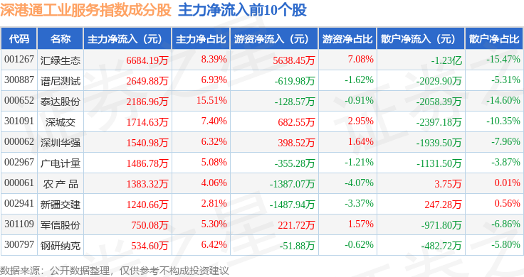 资金流向方面,深港通工业服务(983055)指数成份股当日主力资金净流出合计15.44亿元,游资资金净流入合计1.95亿元,散户资金净流入合计13.48亿元。成份股资金流向详情见下表:
