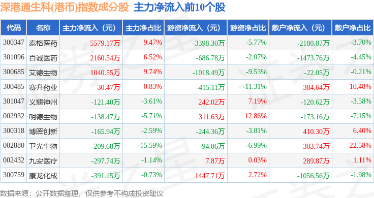 资金流向方面,深港通生科(港币)(983060)指数成份股当日主力资金净流出合计4.22亿元,游资资金净流入合计2.11亿元,散户资金净流入合计2.11亿元。成份股资金流向详情见下表: