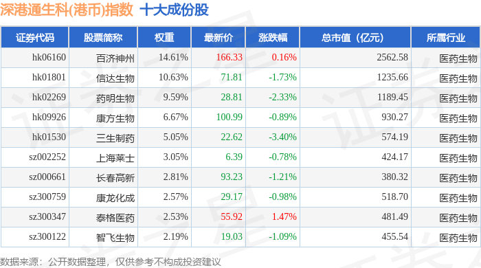 深港通生科(港币)(983060)指数十大成份股详情如下:
