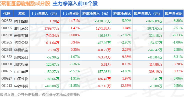 资金流向方面,深港通运输(983077)指数成份股当日主力资金净流出合计2.97亿元,游资资金净流入合计5073.63万元,散户资金净流入合计2.46亿元。成份股资金流向详情见下表: