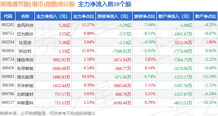 资金流向方面,深港通节能(港币)(983086)指数成份股当日主力资金净流出合计49.83亿元,游资资金净流入合计9.24亿元,散户资金净流入合计40.59亿元。成份股资金流向详情见下表: