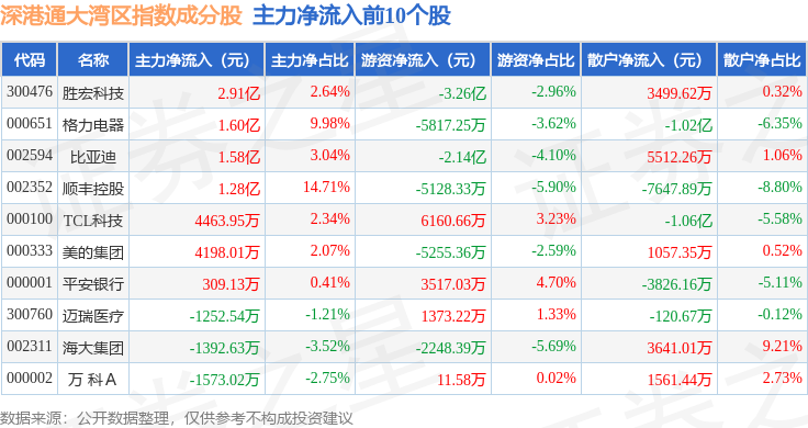 资金流向方面,深港通大湾区(983089)指数成份股当日主力资金净流出合计12.26亿元,游资资金净流出合计1.42亿元,散户资金净流入合计13.68亿元。成份股资金流向详情见下表: