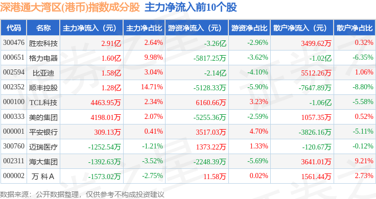 资金流向方面,深港通大湾区(港币)(983090)指数成份股当日主力资金净流出合计12.26亿元,游资资金净流出合计1.42亿元,散户资金净流入合计13.68亿元。成份股资金流向详情见下表: