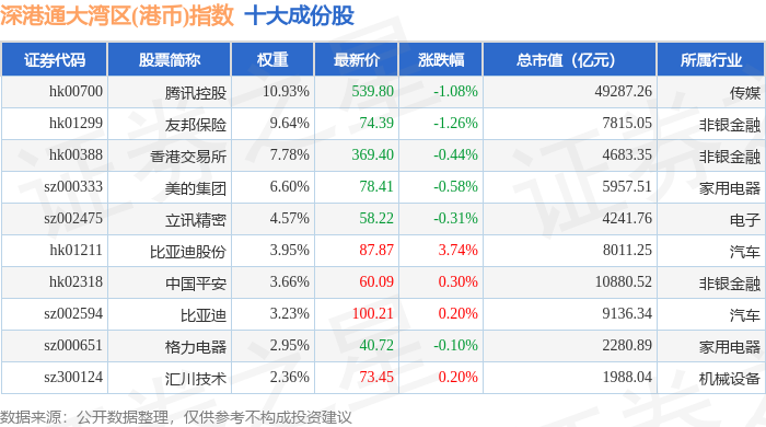 深港通大湾区(港币)(983090)指数十大成份股详情如下: