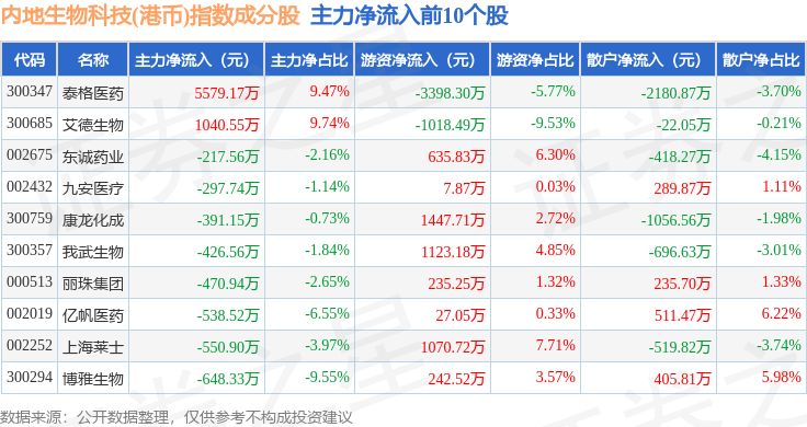 资金流向方面,内地生物科技(港币)(983102)指数成份股当日主力资金净流出合计5.51亿元,游资资金净流入合计2.52亿元,散户资金净流入合计2.98亿元。成份股资金流向详情见下表: