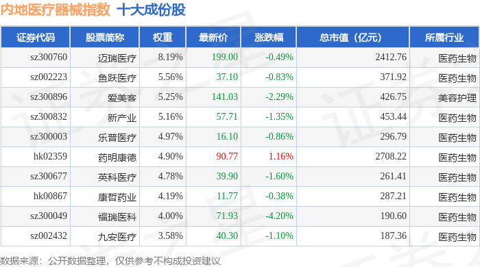 内地医疗器械(983103)指数十大成份股详情如下: