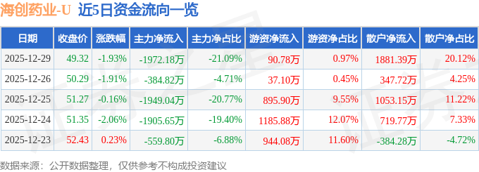 证券之星消息,截至2025年12月29日收盘,海创药业(688302)报收于49.32元,下跌1.93%,换手率1.91%,成交量1.89万手,成交额9352.69万元。
