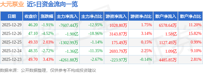 证券之星消息,截至2025年12月29日收盘,大元泵业(603757)报收于46.2元,下跌1.91%,换手率6.72%,成交量12.54万手,成交额5.87亿元。