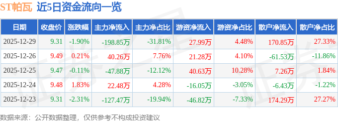 证券之星消息,截至2025年12月29日收盘,ST帕瓦(688184)报收于9.31元,下跌1.9%,换手率0.66%,成交量6682.0手,成交额625.07万元。