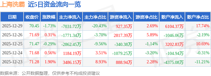 证券之星消息,截至2025年12月29日收盘,上海洗霸(603200)报收于70.45元,下跌1.73%,换手率2.77%,成交量4.86万手,成交额3.44亿元。