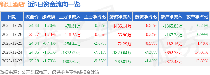 证券之星消息,截至2025年12月29日收盘,锦江酒店(600754)报收于24.84元,下跌1.7%,换手率0.97%,成交量8.79万手,成交额2.19亿元。