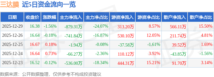 证券之星消息,截至2025年12月29日收盘,三达膜(688101)报收于16.38元,下跌1.56%,换手率0.67%,成交量2.22万手,成交额3652.54万元。