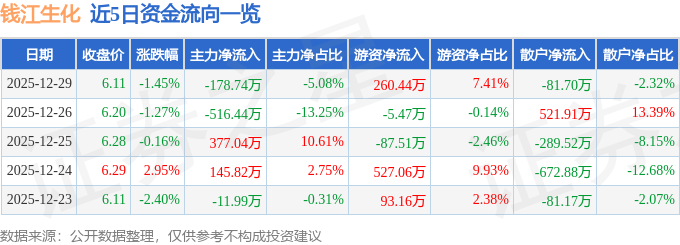 证券之星消息,截至2025年12月29日收盘,钱江生化(600796)报收于6.11元,下跌1.45%,换手率1.84%,成交量5.74万手,成交额3516.81万元。