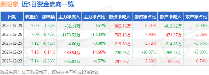 证券之星消息,截至2025年12月29日收盘,泉阳泉(600189)报收于7.0元,下跌1.27%,换手率2.03%,成交量14.5万手,成交额1.02亿元。