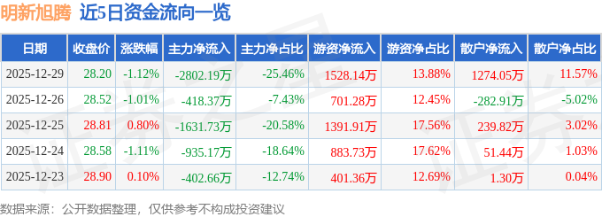 证券之星消息,截至2025年12月29日收盘,明新旭腾(605068)报收于28.2元,下跌1.12%,换手率2.4%,成交量3.89万手,成交额1.1亿元。