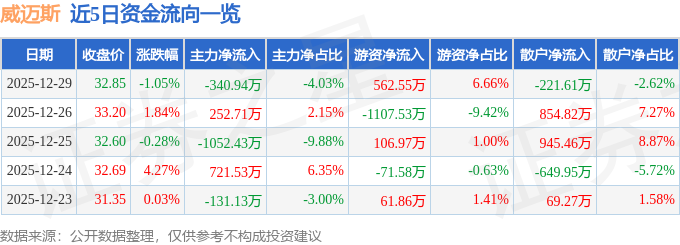 证券之星消息,截至2025年12月29日收盘,威迈斯(688612)报收于32.85元,下跌1.05%,换手率1.02%,成交量2.56万手,成交额8453.06万元。