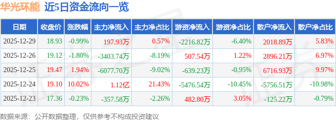 证券之星消息,截至2025年12月29日收盘,华光环能(600475)报收于18.93元,下跌0.99%,换手率1.92%,成交量18.14万手,成交额3.46亿元。