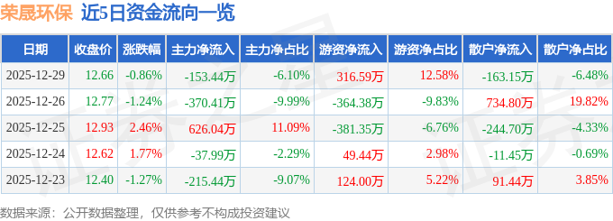 证券之星消息,截至2025年12月29日收盘,荣晟环保(603165)报收于12.66元,下跌0.86%,换手率0.75%,成交量1.99万手,成交额2516.88万元。