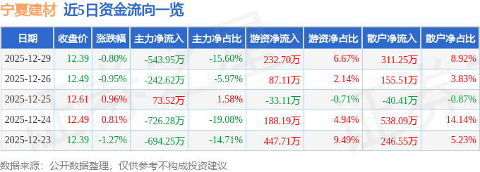 证券之星消息,截至2025年12月29日收盘,宁夏建材(600449)报收于12.39元,下跌0.8%,换手率0.59%,成交量2.8万手,成交额3487.62万元。