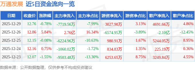 证券之星消息,截至2025年12月29日收盘,万通发展(600246)报收于12.76元,下跌0.78%,换手率3.97%,成交量75.12万手,成交额9.66亿元。