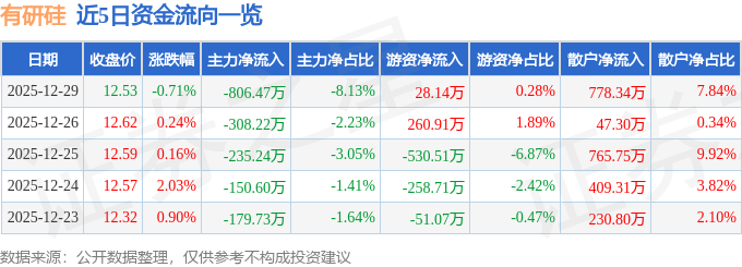 证券之星消息,截至2025年12月29日收盘,有研硅(688432)报收于12.53元,下跌0.71%,换手率0.63%,成交量7.88万手,成交额9924.36万元。