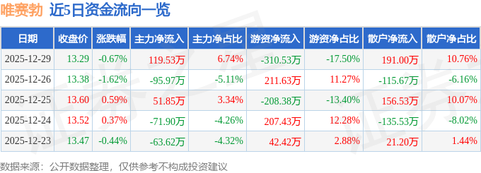 12月29日的资金流向数据方面,主力资金净流入119.53万元,占总成交额6.74%,游资资金净流出310.53万元,占总成交额17.5%,散户资金净流入191.0万元,占总成交额10.76%。