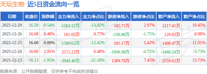 证券之星消息,截至2025年12月29日收盘,天坛生物(600161)报收于16.59元,下跌0.54%,换手率0.35%,成交量7.01万手,成交额1.17亿元。
