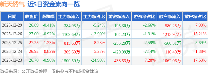 证券之星消息,截至2025年12月29日收盘,新天然气(603393)报收于26.89元,下跌0.41%,换手率0.64%,成交量2.72万手,成交额7348.7万元。